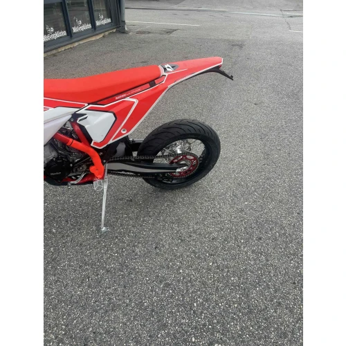 • Sykkelen står på supermotard-dekk. Den leveres enten med supermotard-felger eller enduro-felger. Kan leveres med begge mot et tillegg i pris.